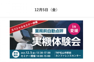 ウェブセミナー 遠隔点呼 遠隔点呼の要件把握から運用開始まで!遠隔点呼徹底解説セミナー12月18日(月) 2023.11.15 お申し込みはこちらから みなさまのご参加をお待ちしております。 業務前自動点呼実機体験会 2025.11.25 【業務前自動点呼 実機体験会~スペシャルセミナー併催~】愛媛にて12月5日(金)無料開催! 業務前自動点呼実機体験会 2025.11.25 【中国地方限定】自動点呼システム「e点呼セルフTypeロボケビー」オンライン商談会12月16日(火) バックオフィスDXPO業務効率化 2025.11.25 バックオフィスDXPO東京25【秋】開幕!安全運転管理を徹底したい事業者様、この機会にぜひご来場ください! 導入事例ユーザレポート自動点呼 2025.11.21 自動点呼、現場でどう活かされている?三福運輸株式会社様の導入事例動画を公開