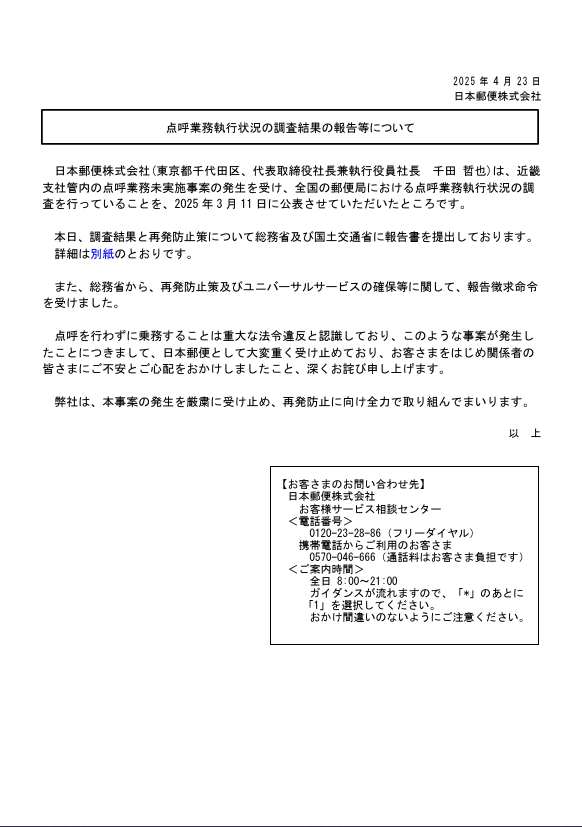 その後、全国の郵便局において点呼業務執行状況の調査を実施し、結果が取りまとまりましたので、調査結果及び再発防止策等を報告します。