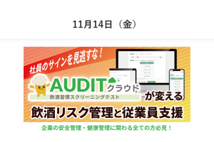 企業の安全管理・健康管理に関わる全ての方々必見!社員のサインを見逃すな!「AUDIT クラウド」が変える飲酒リスク管理と従業員支援 11月14日(金)