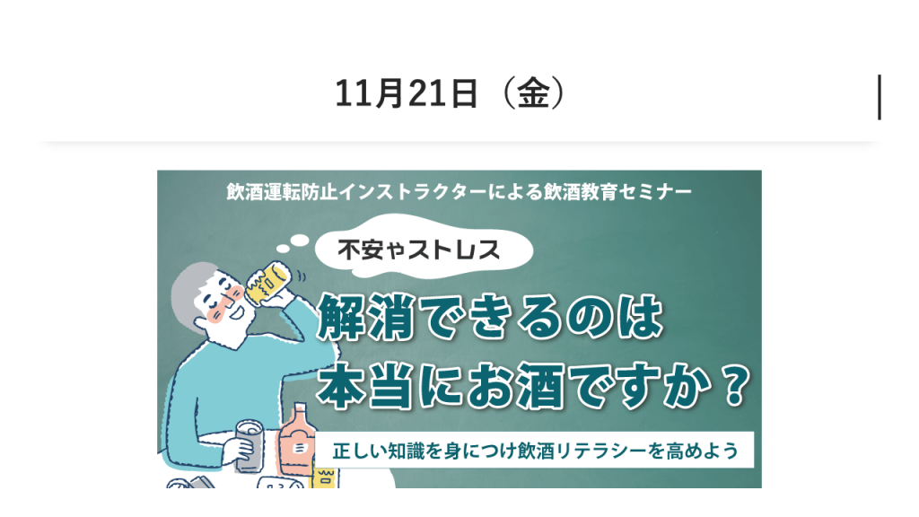 不安やストレス、解消できるのは本当にお酒ですか? ~正しい飲酒知識を学び飲酒リテラシーを高めよう~ 11月21日(金)