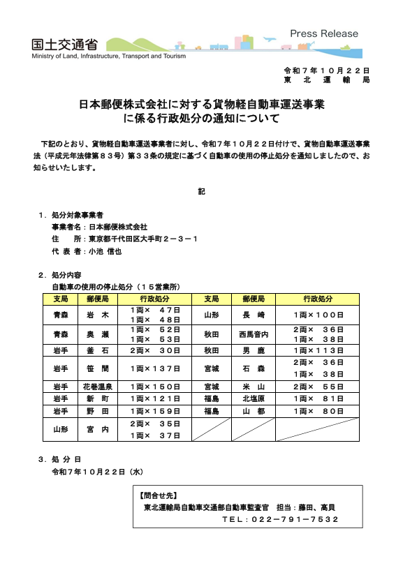 東北運輸局、行政処分結果。あなたの近くの郵便局で車両は停止された?