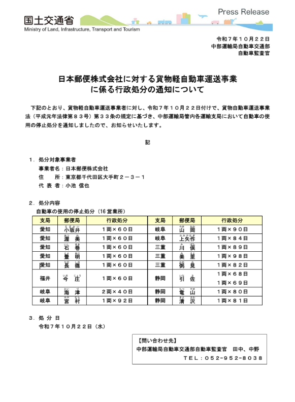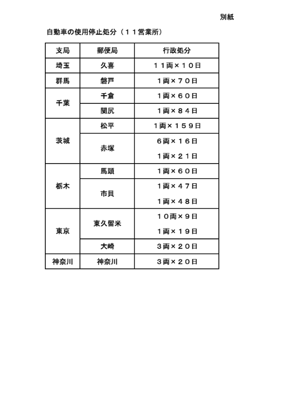 関東運輸局、行政処分結果。あなたの近くの郵便局で車両は停止された?