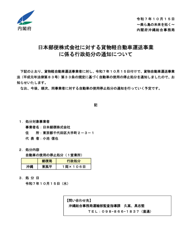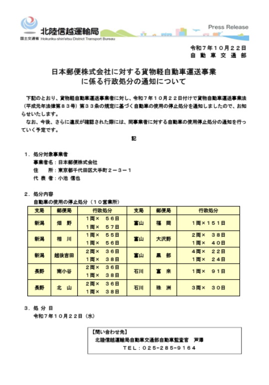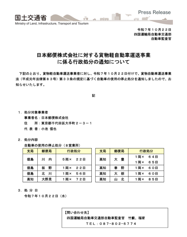 北海道運輸局、行政処分結果。あなたの近くの郵便局で車両は停止された?