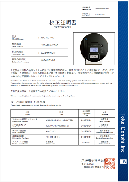 アルコール検知システム、点呼システム、運行管理システム、安全運転管理システムを開発・販売 する東海電子株式会社(本社:静岡県富士市 代表取締役 杉本 哲也)は、この度2025年11月4日より、『校正証明書DLサービス』校正証明書 電子データダウンロード・発行サイトをリニューアルいたしました。