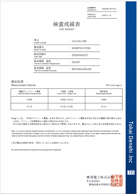 ・アルコール検知器の製造番号を入力いただき校正証明書を取得の際、同時に検査成績書をダウンロード・印刷いただくことが可能となります。