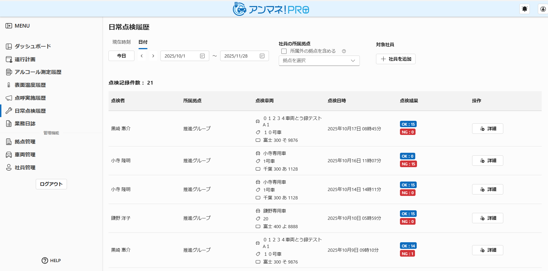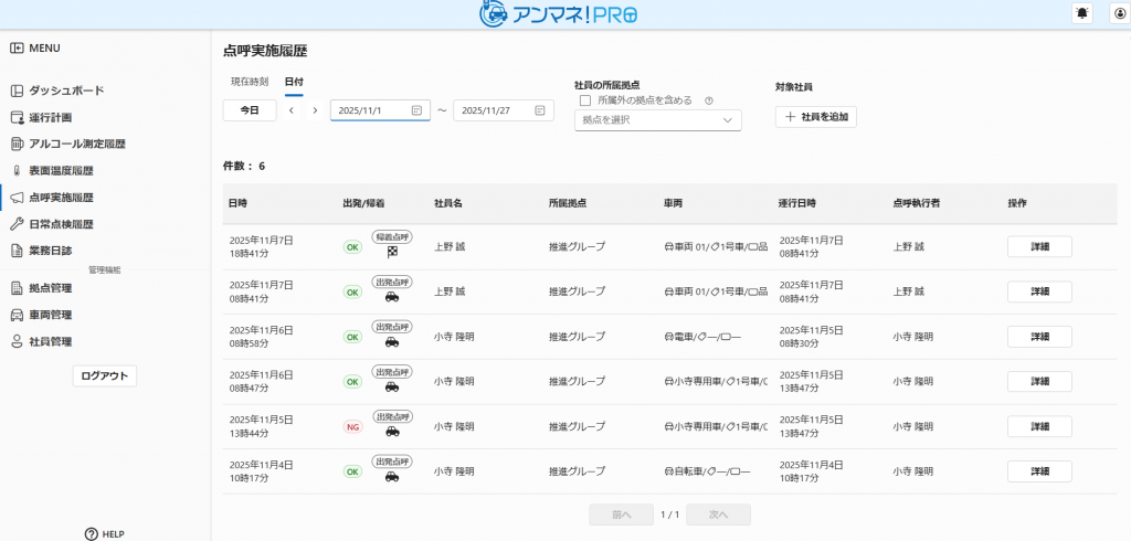 点呼依頼が入ると、ダッシュボード画面に点呼依頼が表示され、順次、点呼の実施を行うこととなります。その後、実施した点呼の履歴を確認するのが、この「点呼実施履歴」画面です。