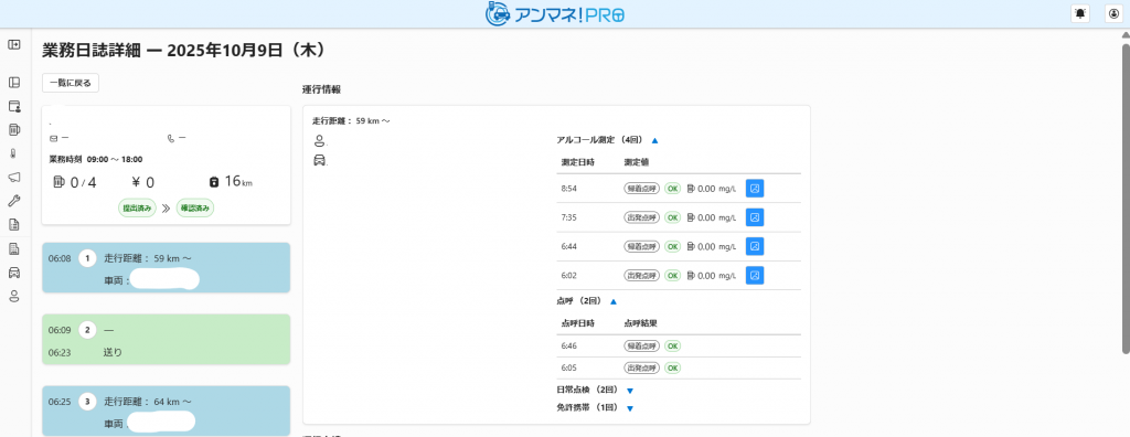 詳細ページでは、運行情報として、アルコール測定・点呼・日常点検・免許携帯の記録を見ることができます。地図上に運行経路も表示されます。
