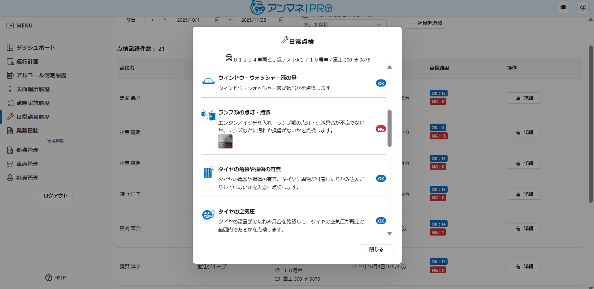 車両の点検項目は15項目ありますが、点検結果の欄において、OK・NGの表示にて、チェックが済んでいる項目件数を確認することができます。この項目は、運転手さんのチェックにおいて、万が一抜けもれが発生してしまった際、管理者がスムーズにフォローするために、ひと目でみてわかりやすい仕様となっています。