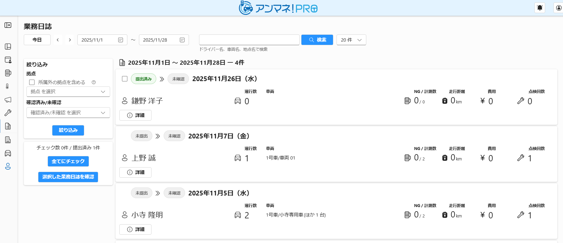 業務日誌では社員名、車両名、地点名での検索ができます。画面左側の「絞り込み」表示で、細かい絞り込みの設定も可能です。