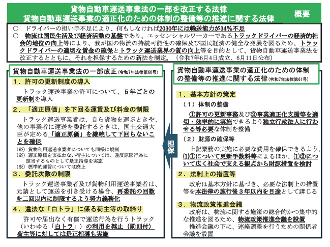 令和7年6月には「許可更新制度の導入」、「『適正原価』を下回る運賃・料金の制限」などを盛り込んだ「貨物自動車運送事業法の一部を改正する法律」および同法を担保する「貨物自動車運送事業の適正化のための体制の整備等の推進に関する法律」が成立しました。