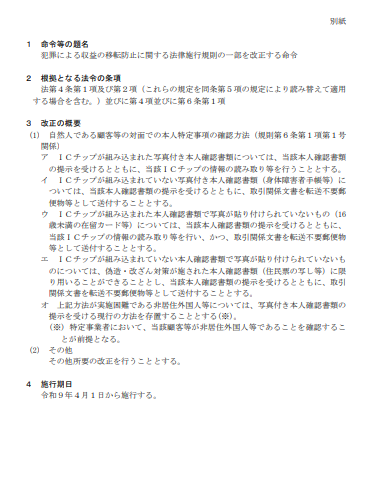 金融機関等が行う本人確認方法の見直しを行うものであります。具体的には、対面で写真付き本人確認書類の提示を受ける現行の方法につきまして、対象書類をICチップ付きのものに限定するとともに、当該ICチップの情報の読み取りを必須とする