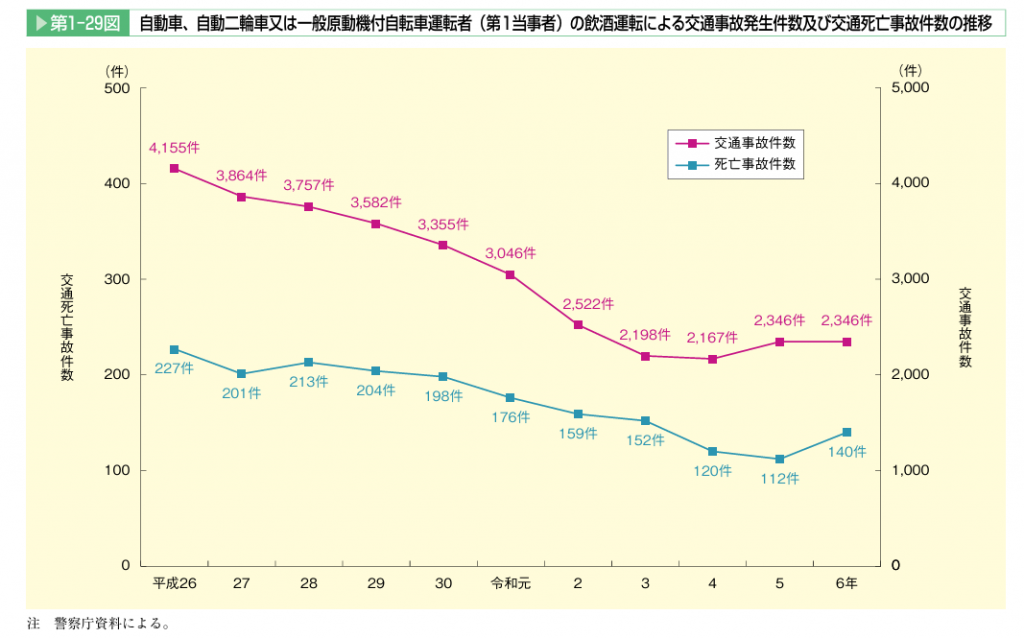 ⑺飲酒運転根絶に向けた交通安全教育及び広報啓発活動等の推進令和6年中の飲酒運転による交通事故件数は2,346件で、23年ぶりに増加に転じた昨年と同数となった。ア 「飲酒運転を許さない社会環境づくり」の取組 飲酒運転の危険性や飲酒運転による交通事故の実態等について積極的に広報するとともに、飲酒が運転等に与える影響について理解を深めるため、映像機器や飲酒体験ゴーグルを活用した参加・体験型の交通安全教育を推進した。また、交通ボランティアや交通安全関係団体、酒類製造・販売業、酒類提供飲食業等の関係業界と連携して、(一財)全日本交通安全協会等が推進している「ハンドルキーパー運動※」への参加を広く国民に呼び掛けるなど、関係機関・団体等と連携して「飲酒運転を絶対にしない、させない」という国民の規範意識の更なる向上を図った。 また、運転免許の取消し等の処分を受けた飲酒運転違反者※に対し、飲酒行動の改善等のためのカリキュラムを盛り込んだ取消処分者講習(飲酒取消講習)や、停止処分者講習を実施し、飲酒運転の危険性等についての重点的な教育を行った。 さらに、安全運転管理者による運転者に対するアルコール検知器を用いた酒気帯びの有無の確認等の義務について、安全運転管理者に対する講習の機会等を活用することにより、履行の徹底を図った。