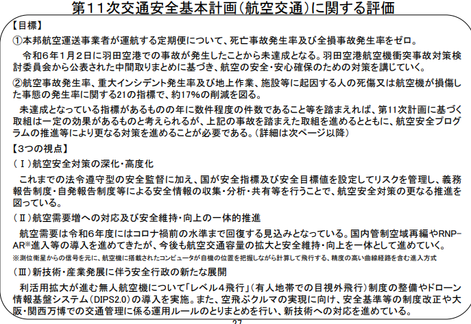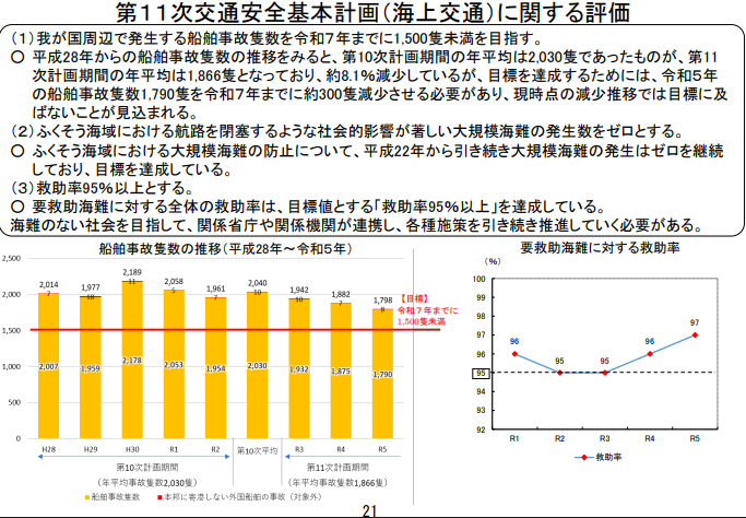 している。海上交通については、近年、船舶事故隻数は減少傾向で推移しているものの、小型船舶を中心にヒューマンエラーに起因する船舶事故が多く、令和4年には知床遊覧船事故が発生している 。航空事故については 、近年は、大型飛行機による航空事故は乱気流等気象に起因するものを中心に年数件程度に止まり、小型飛行機等が事故の大半を占めているが、令和6年には羽田空港航空機衝突事故が発生している。第11次交通安全基本計画は、「究極的には交通事故のない社会を目指すことを再認識すべきである」ことを冒頭に明示し、交通事故被害者の存在に思いを致し、
