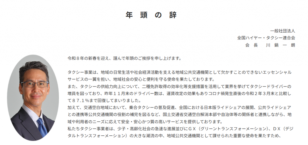 私どもハイヤー・タクシー事業者は、地方創生を担う重要な社会インフラであるという認識の下、今後とも国民に対する安全・安心な輸送サービスを確保すべく、業界一致団結し、労働組合、個人タクシー業界、バス業界、自動車メーカー、消費者団体、「交通の安全と労働を考える市民会議」そして全国の地方自治体と緊密に連携し、ライドシェア新法の制定に断固として反対してまいります。 最後に、自動運転については、アメリカや中国ではドライバーが乗車しないタクシーが商用として実用化され、国内においてもタクシー事業者による自動運転タクシーの情報収集のための試験運行が始まっています。中長期的な生産年齢人口の減少を踏まえると、自動運転タクシーはタクシー供給力の確保のための有効な手段となるものと期待されることから、現在のタクシー事業と同等か、それ以上の安全性がタクシー事業者の責任において確保されることを基本として、タクシー業界における運行管理、整備管理等の経験の蓄積を還元できるよう、社会実装のための制度のあり方等についての検討に積極的に参画し、移動の未来を託すべき自動運転タクシーの実用化に向け、主体的に関与してまいります。