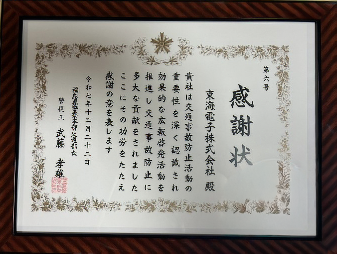 感謝状は、東海電子がこれまで取り組んできた交通事故防止・飲酒運転根絶に向けた