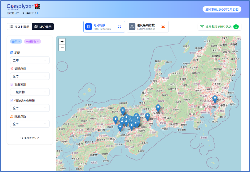自動点呼システム、運行管理システム、安全運転管理システム、労働安全衛生システムを開発・販売する東海電子株式会社(本社:静岡県富士市 代表取締役 杉本哲也)は、昨年10月、運輸安全・交通オープンデータ活用AIプロジェクト “運輸安全AIラボ”を立ち上げました。今般、第四弾として、緑ナンバー事業者の行政処分動向から、業界の安全度を分析する“Complyzer(コンプライザー)”の提供を開始致します。
