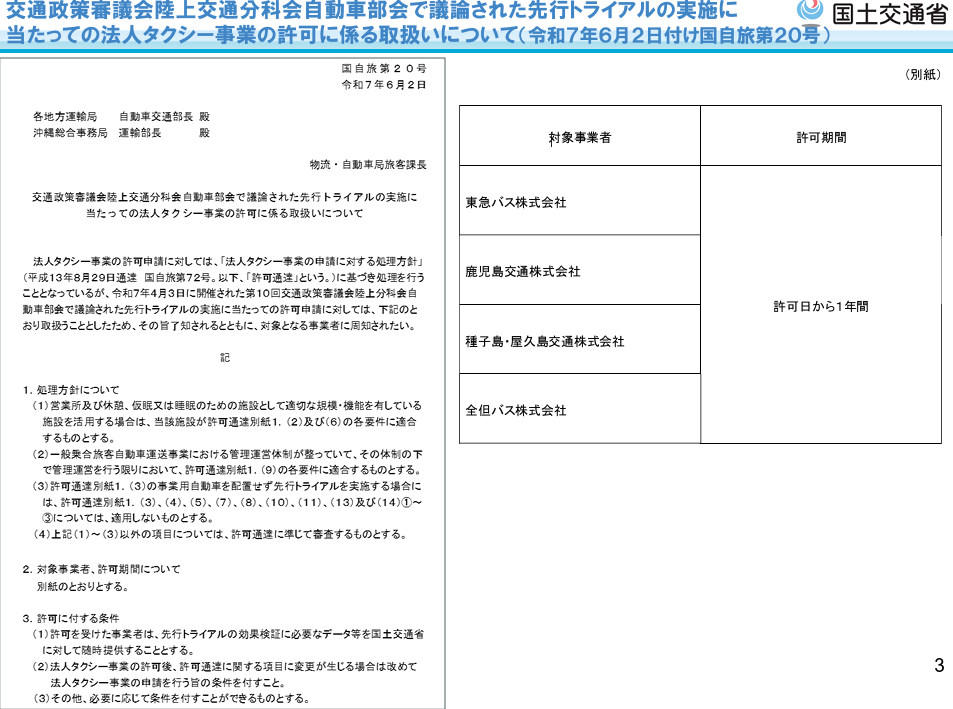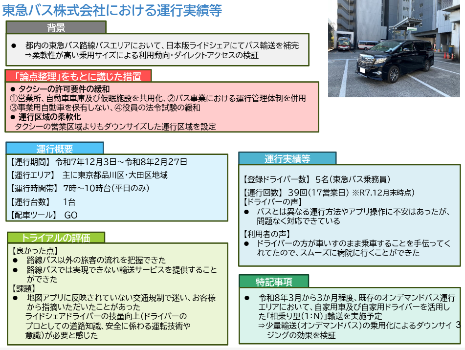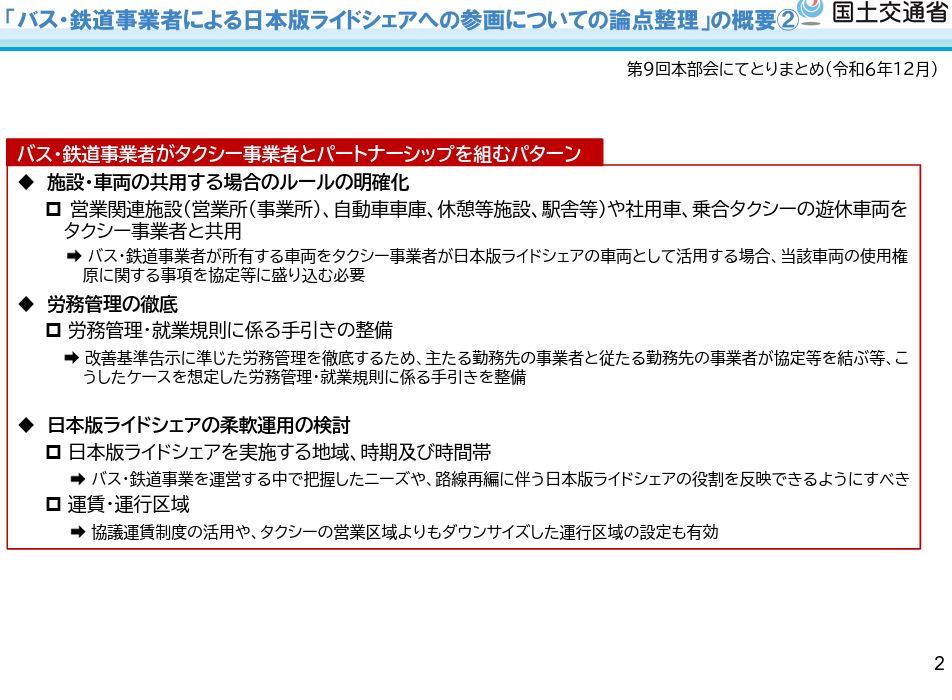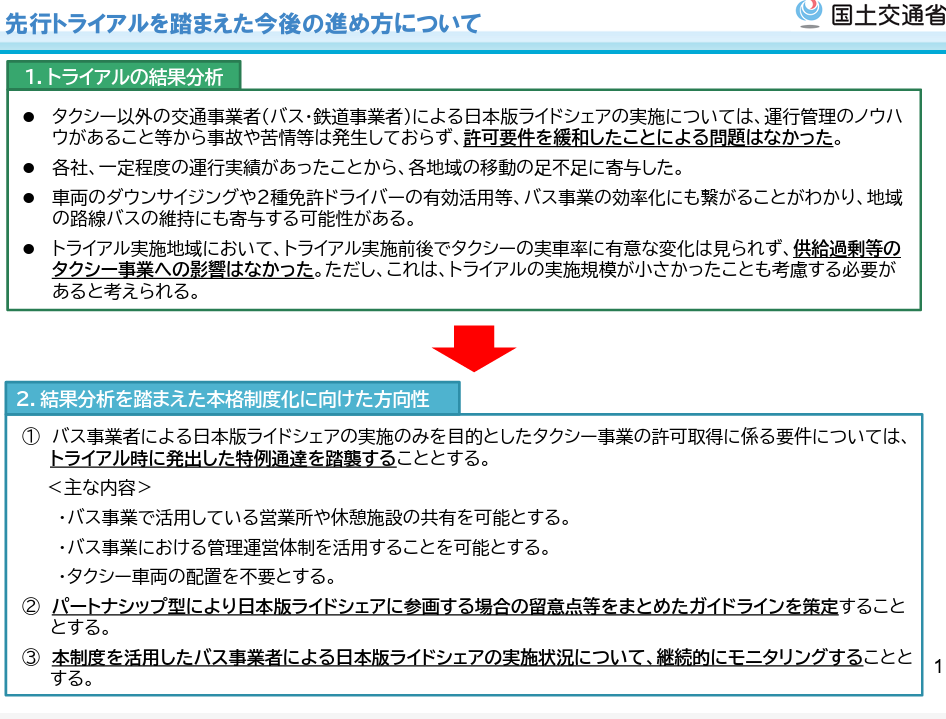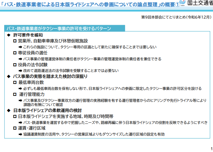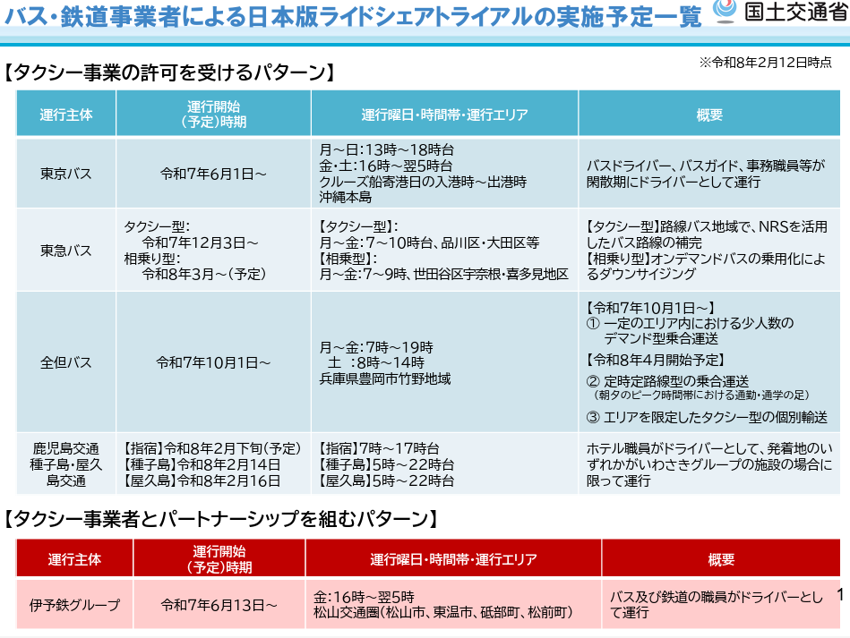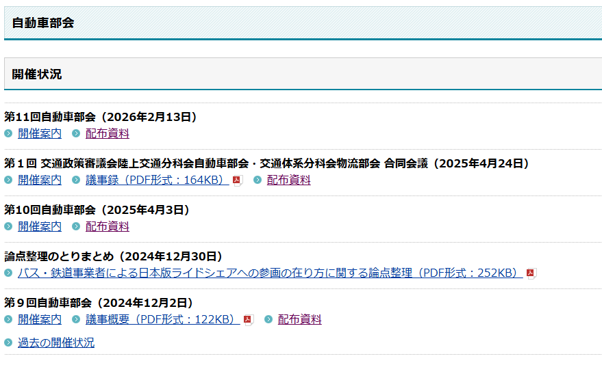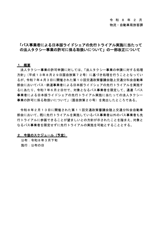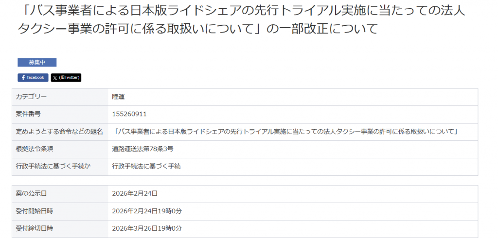 パブリックコメント 日本版ライドシェア 「バス事業者による日本版ライドシェアの先行トライアル実施に当たっての法人タクシー事業の許可に係る取扱いについて」の一部改正について、パブリックコメント開始。 2026.3.5 バス・鉄道事業者による日本版ライドシェアへの参画のあり方については、2024年から議論され、先行トライアルも実施されてきた。 今般2026年2月13日、先行トライアル実施の評価が行われ、今後の進め方についても方向性が示された。 資料1 https://www.mlit.go.jp/policy/shingikai/content/001983809.pdf 資料2 https://www.mlit.go.jp/policy/shingikai/content/001983810.pdf 資料3 https://www.mlit.go.jp/policy/shingikai/content/001983811.pdf バス・鉄道事業者による日本版ライドシェア。 なんだこれ。 一般社会人は、コレ聞いて、普通に意味分かりますかね? 「一般人・一種免許でも可能な自家用自動車活用事業」を、こうも露骨に「事業者寄り」にするとは。 パブリックコメント開始。 パブリックコメント保安基準 2026.3.3 キャプテンアメリカかよ! コレなーんだ? 国土交通省はひそかにシャレで理不尽さを表明しているのではないか? 保安基準が外圧で即 事業用自動車総合安全プラン2030パブリックコメント 2026.3.1 安全プラン2030パブコメ、残り1秒、わはは。ハラハラドキドキ、間に合ったかなあ? アルコールインターロック法制化アルコール健康障害対策推進基本計画 2026.2.28 第3期アルコール健康障害対策推進基本計画、飲酒運転問題に関して15の具体的施策を盛り込むも、アルコールインターロック「普及促進」は、国土交通省にボールを投げて終わり。国交省はもう十分やっているのに。 自動運転ライドシェア 2026.1.8 国土交通省 第三次 交通政策基本計画。ライドシェアの基本計画(政策)、自動運転普及の基本計画、5年後どうなっている?