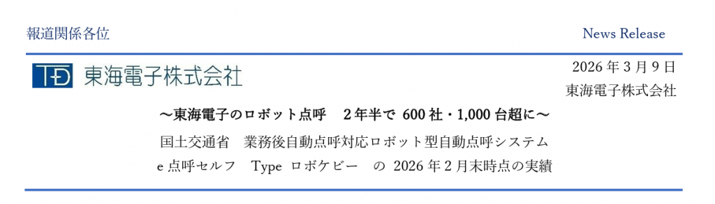 東海電子のロボット点呼『e点呼セルフ Typeロボケビー』販売2年半で600社・1,000台を突破! 〜2026年2月末時点の出荷実績〜