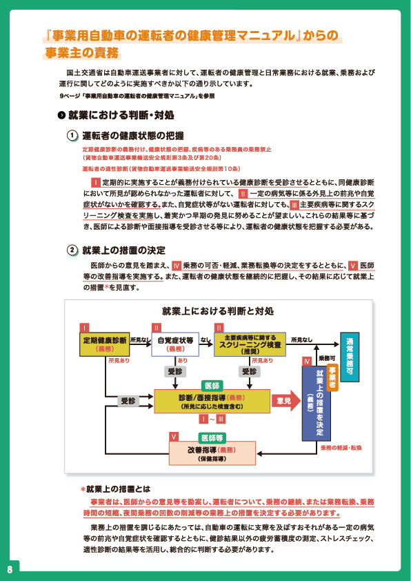 ドライバーの健康診断が義務付けられている中で、「実施した」で終わらせず、その結果をもとにどのように就業判断や受診につなげるかといった、具体的な実務が示されています。