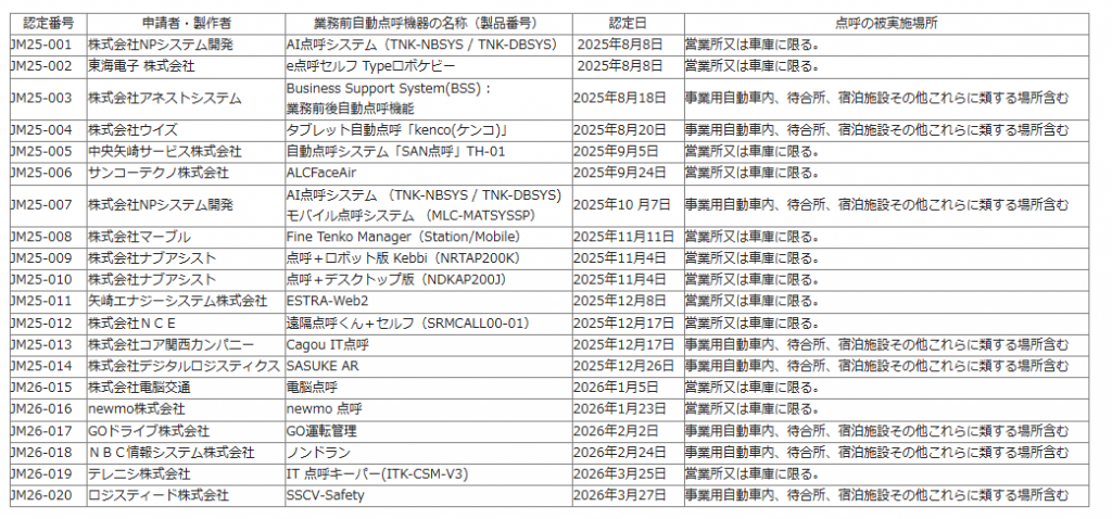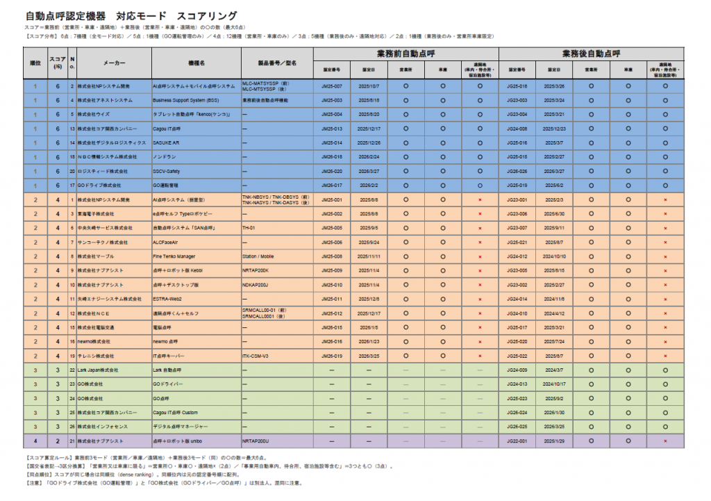 自動点呼 認定機器、もっとも優れた自動点呼機種は? に○○がお答えします。 2026.4.23 あまりにも、コレ と、 コレ が、お客様に分かりづらいのではないかと思い。 点呼モードを整理して、客観的にスコアリングさせてみました。(←また手抜き♡) (AIで作成) 念のため今回のAIの結果は、ヒトによる目視確認しました。(一部間違えがあったので正しく修正しました) スコア企業数1番手グループ8社(同順位)2番手グループ12社(同順位)3番手グループ5社(同順位)4番手グループ1社 東海電子、ドコだ? 2番手グループだよ・・・。 併せてこちらもどうぞ。 業務前 VS 業務後、いま、どんだけ~? 隣の会社で、ロボット点呼が? 国土交通省予算補助金 2026.4.20 122兆円、うち自動点呼、9億くらいだろうか? 運行管理ウェブセミナークラウド管理自動点呼 2026.4.16 いま求められる運行管理のかたちとは~時代に即したクラウド管理・自動点呼のご提案~5月14日(木) 自動点呼熱中症対策 2026.4.15 「水分をとってください」点呼ロボットが担う熱中症対策の声かけ 業務前自動点呼実機体験会 2026.4.8 【業務前自動点呼 実機体験会】静岡(沼津)にて4月23日(木)無料開催!