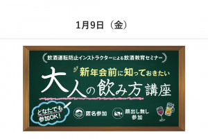 飲酒運転防止インストラクターによる飲酒教育セミナー どなたでも参加OK!新年会前に知っておきたい“大人の飲み方講座” 1月9日(金)
